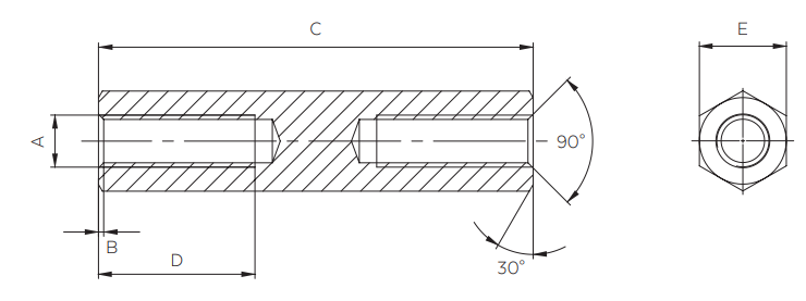 - Hexagonal spacer bolts with full-length internal thread